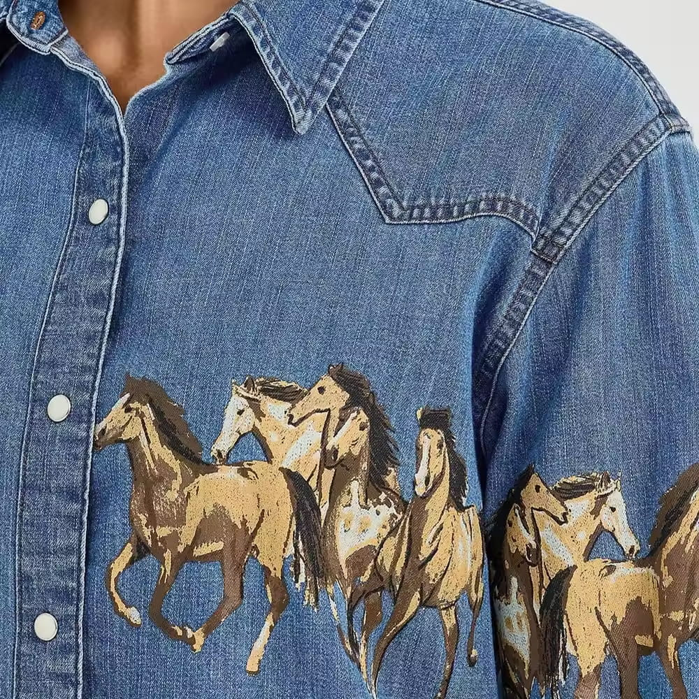 Upgrade your seasonal collection with this custom denim shirt women piece, designed for both fashion and comfort. Featuring a unique horse print pattern, this shirt jacket blends artistic style with everyday wearability.
