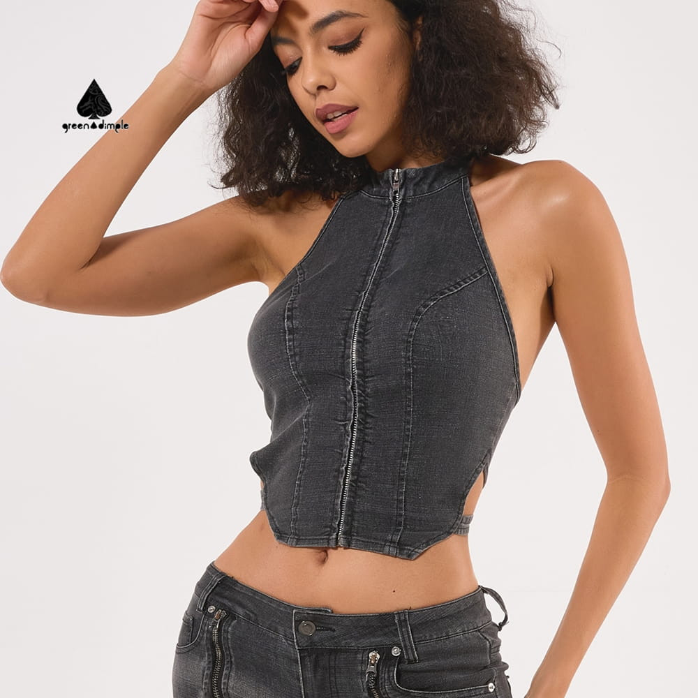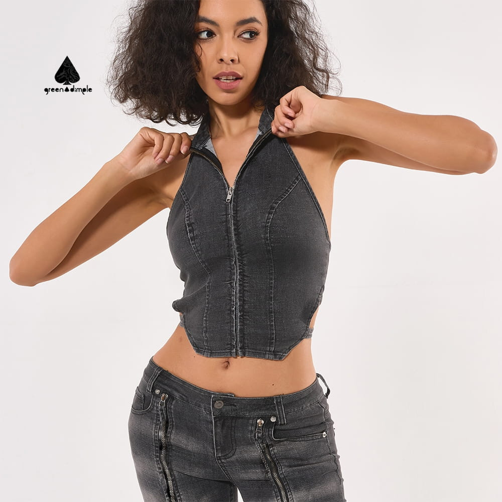 Greendimple Y2K Black Denim Halter Crop Top | Side Cutout Zip-Up Vest