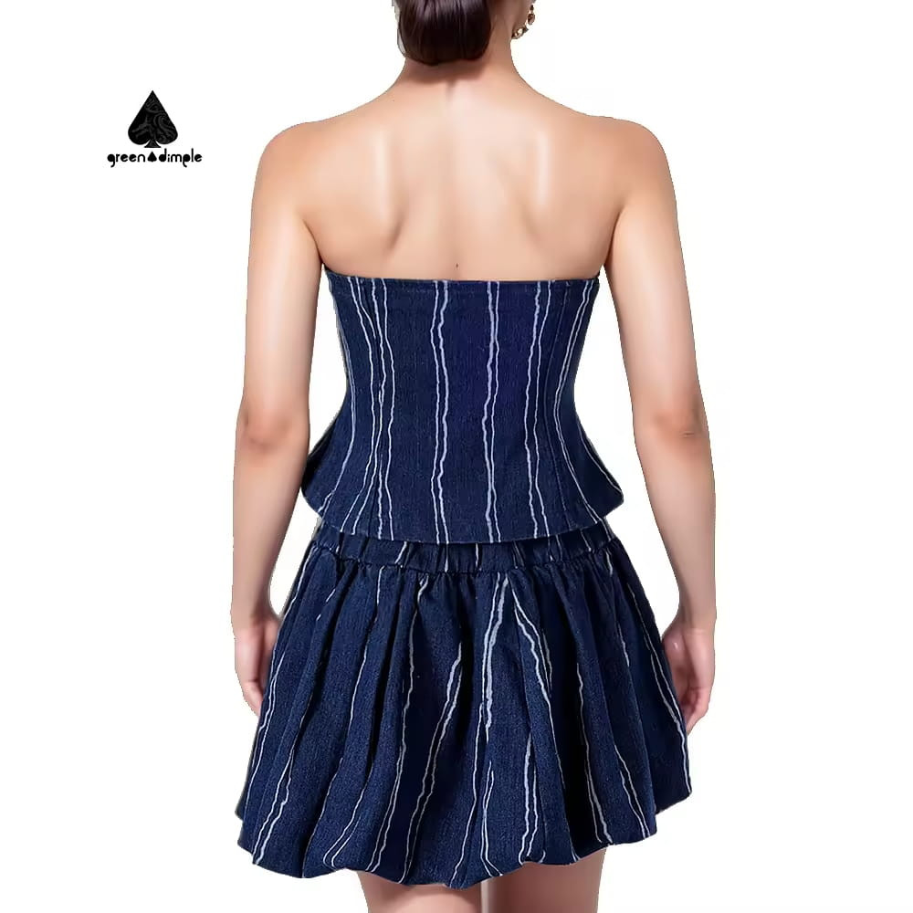 Upgrade your summer collection with this stylish denim tube top and skirt set for women. Designed for modern fashion brands, this two-piece outfit features a strapless tube top paired with a mini denim skirt, creating a bold and trendy silhouette perfect for warm weather.