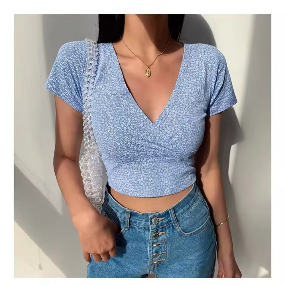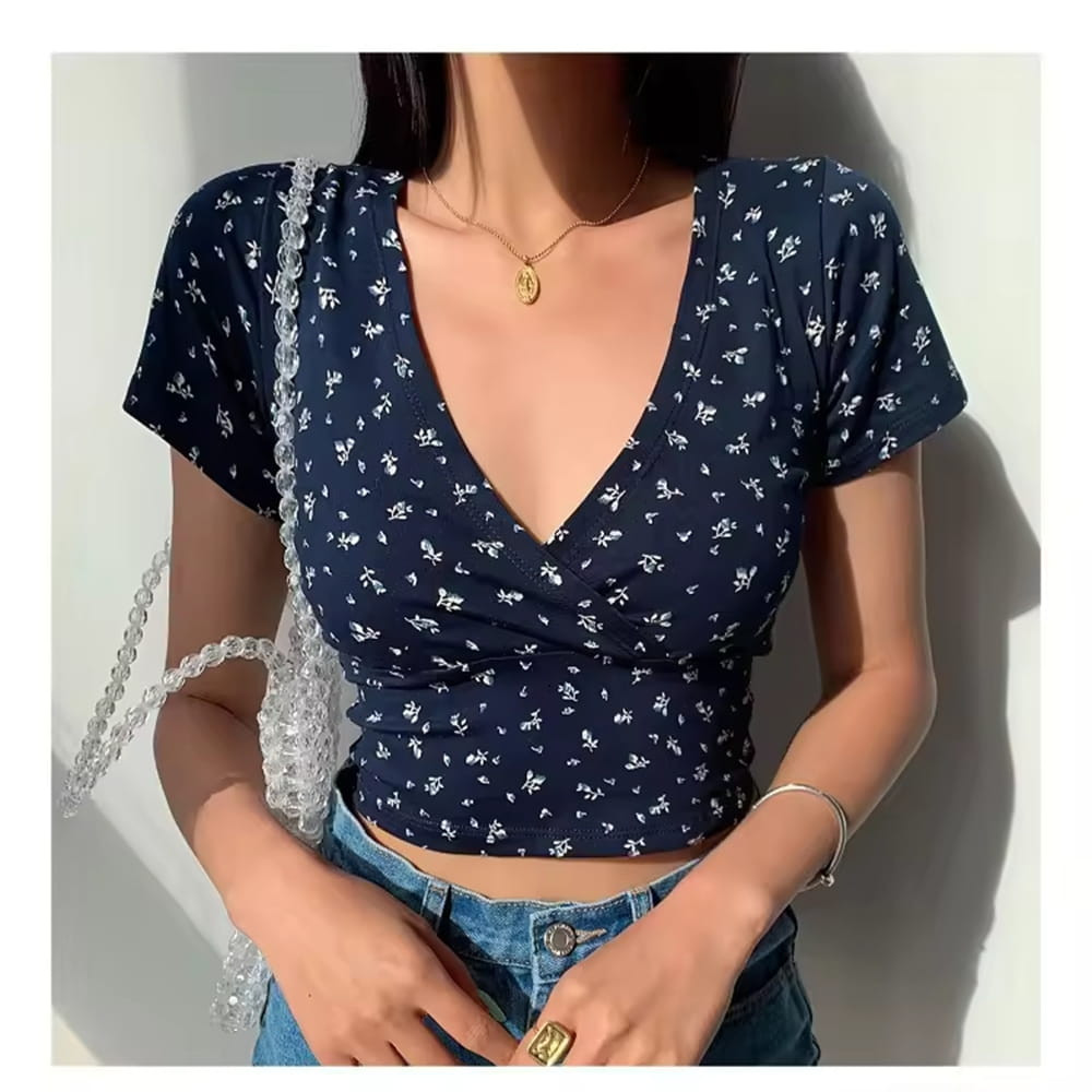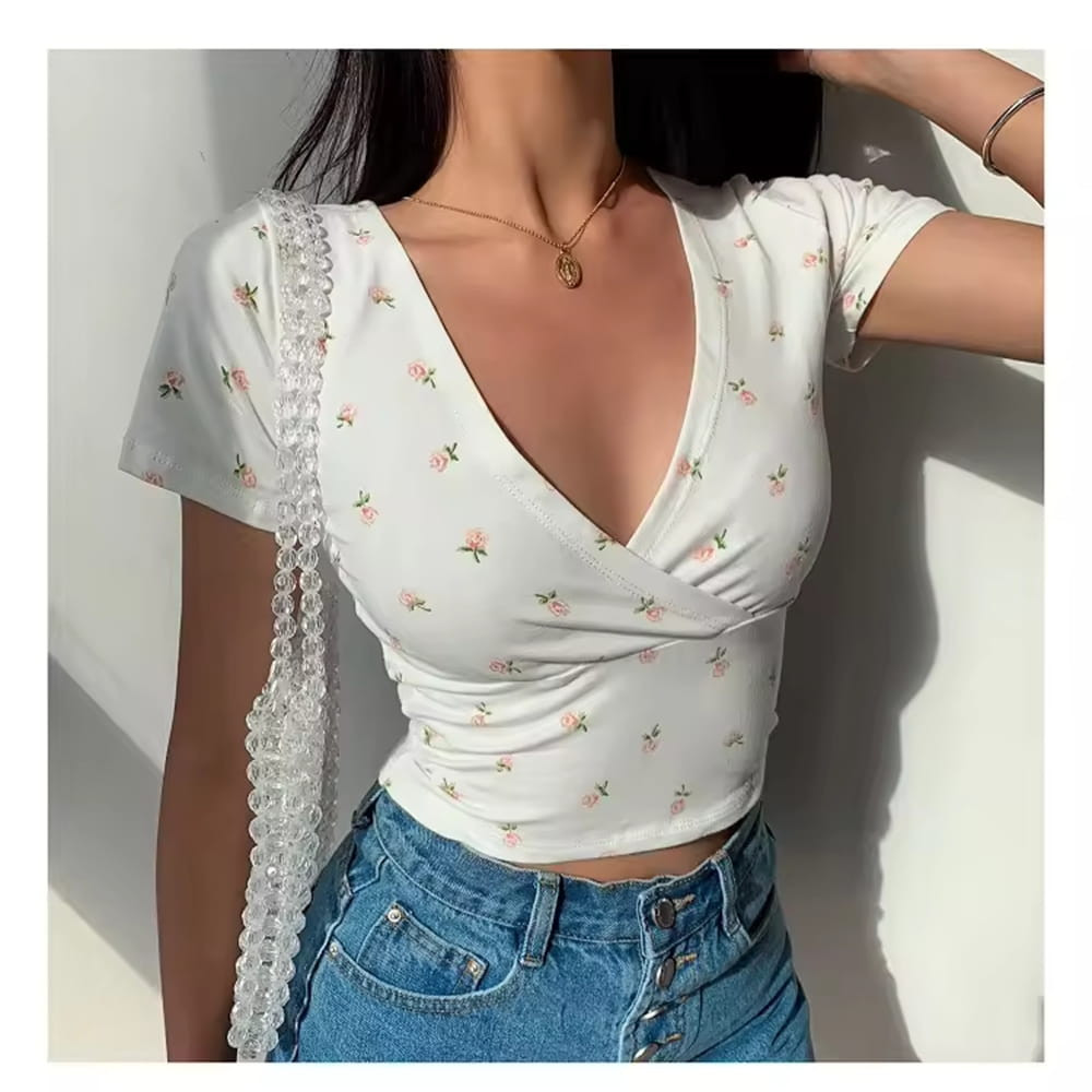 This floral crop top is designed to bring a fresh and feminine touch to your wardrobe. Featuring a flattering V neck and slim fit silhouette, it enhances your natural shape while maintaining comfort.